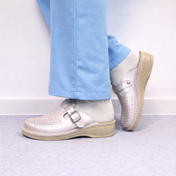 Damesklompen gemaakt van het fijnste natuurlijke leer en een leren binnenzool met 8 mm massagegel, ideaal voor mensen met hielspoorproblemen.