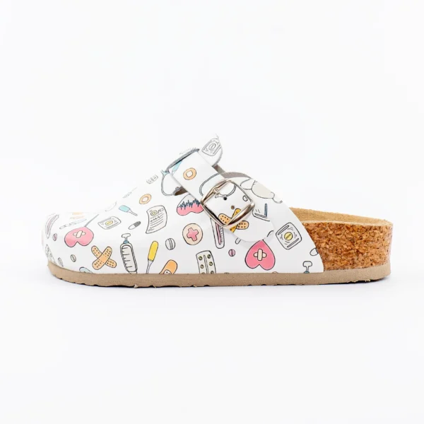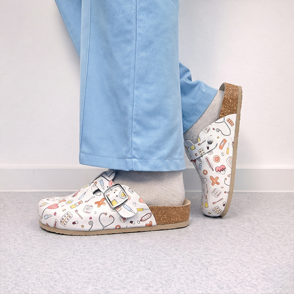 Anatomische klompen met print, gemaakt van rundleer, bieden betrouwbare ondersteuning bij dagelijkse activiteiten .