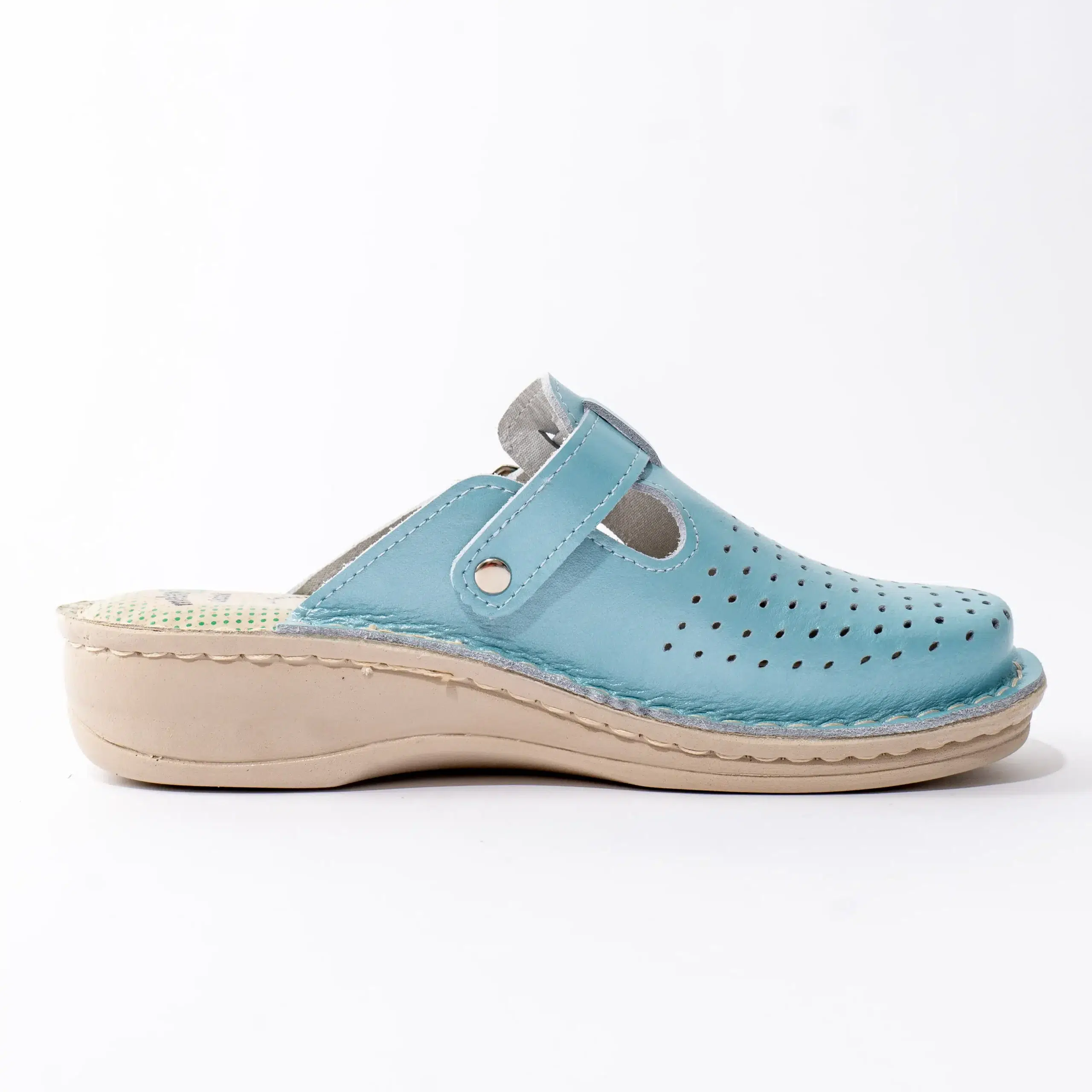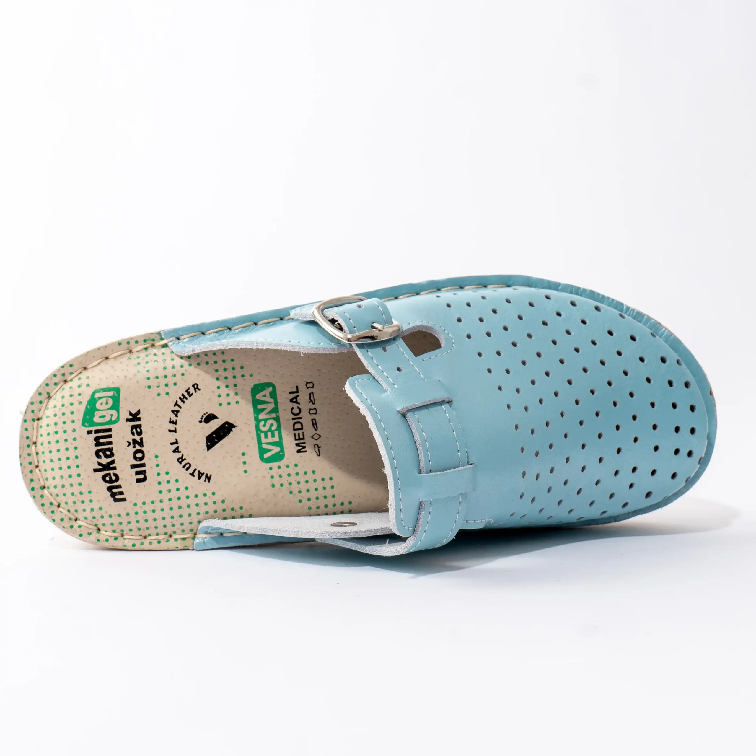 Damesklompen gemaakt van het fijnste natuurlijke leer en een leren binnenzool met 8 mm massagegel, ideaal voor mensen met hielspoorproblemen.